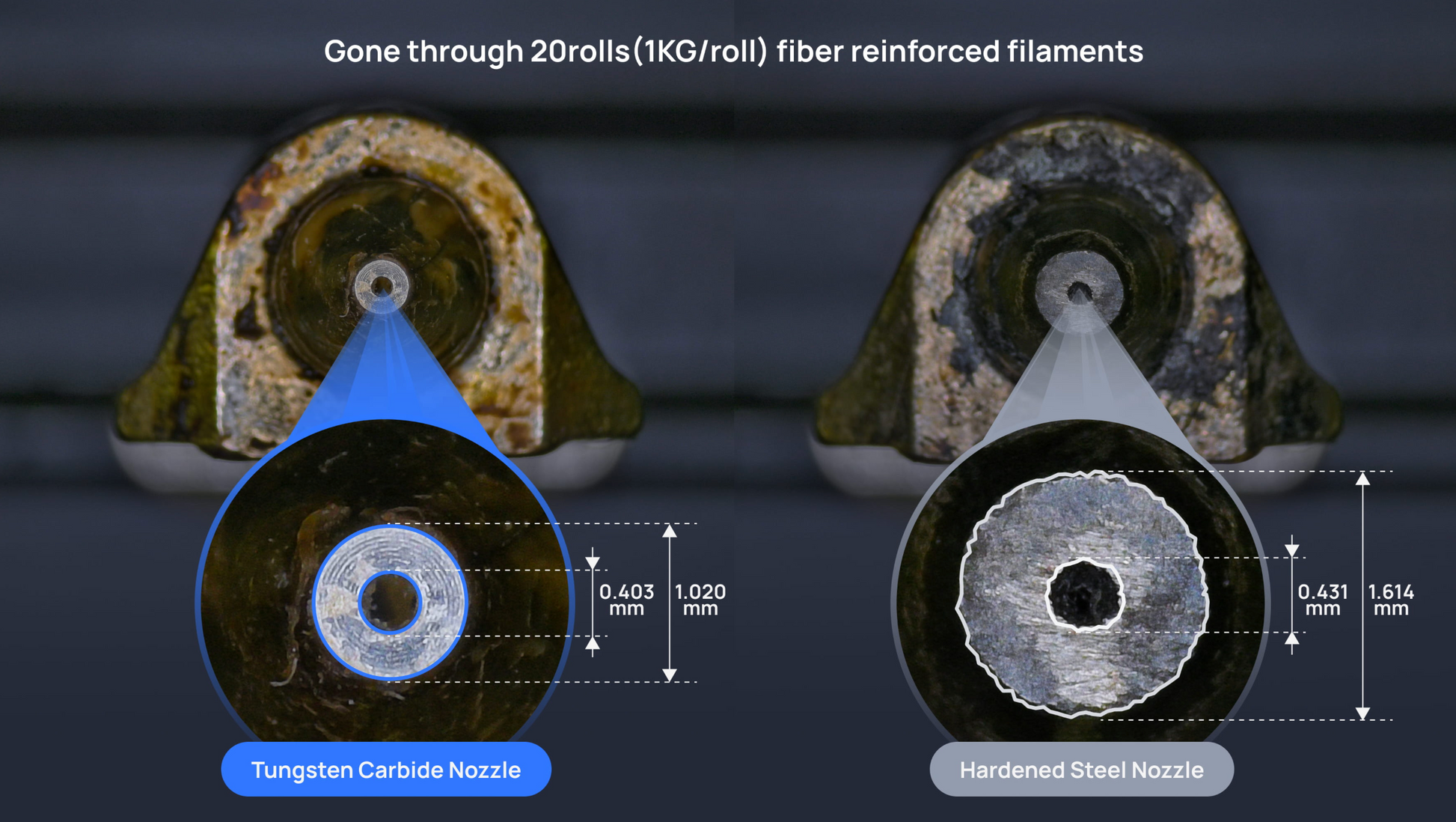 - Nozzle in carburo di tungsteno: lunga durata con materiali abrasivi (CF/Glass).
