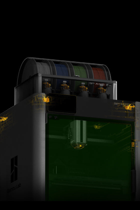 La Bambulab H2S Combo aggiunge al modello base un AMS, per passaggi di filamento automatici e workflow fluido. Stampa multicolore e multi-materiale senza interruzioni.
