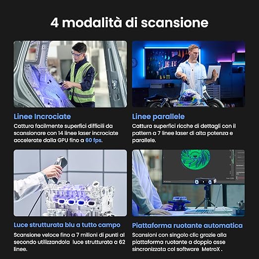 Modalità scan: handheld e desktop; modalità automatica con piatto rotante a doppio asse, utile per oggetti medi saturi