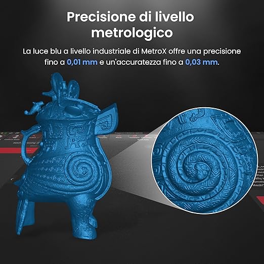 Precisione di livello metrologico: precisione per fotogramma fino a 0,01 mm; accuratezza fino a 0,03 mm; accuratezza volumetrica di 0,03 mm + 0,1 mm × L (m)