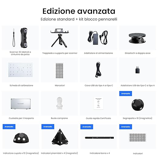 Kit completo Advanced: include marcatori magnetici e kit adesivi per un tracking affidabile e rapido, più una piattaforma girevole automatica per scansioni completamente automatizzate.